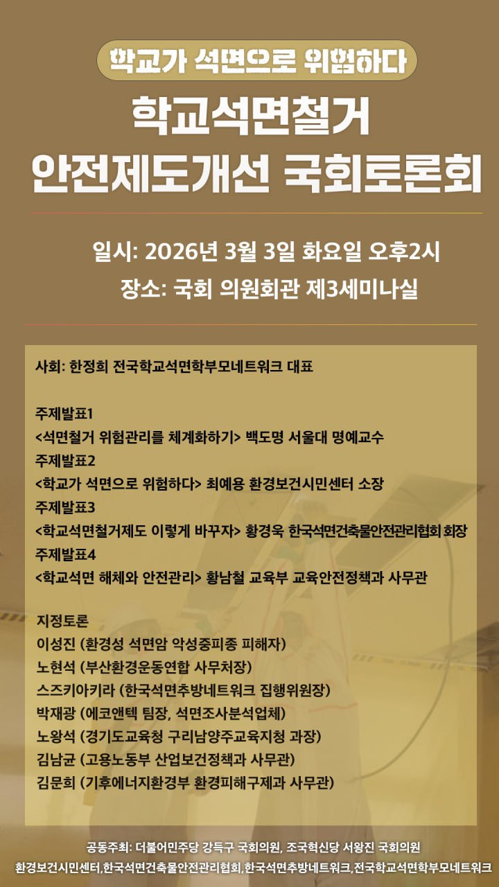 - 1급 발암물질 석면위험으로부터 안전한 학교를 만들기위한 학교석면철거정책이 전국 2만여개 학교를 대상으로 10여년 째 추진되고 있고 2027년까지 남은 1천여개 학교에서 석면철거가 진행될 예정이다. 그러나 석면조사, 석면철거, 안전모니터링의 단계마다 안전지침이 안지켜진다는 지적이 이어져 왔다. 고용노동부의 산업안전관리법, 기후에너지환경부의 석면안전관리법, 지자체의 폐기물관리법, 교육부의 학교환경보건법 등 여러 안전제도가 있지만 석면철거 학교현장에선 안전지침이 심각하게 위배되는 일이 그치지 않고 있다.