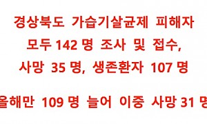2016년7월31일까지의 경상북도의 가습기살균제 피해신고는 모두 142명이고 이중 사망은 35명입니다.보고서 파일은 아래 클릭해서 다운 받으세요.http://eco-health.org/bbs/board.php?bo_table=sub02_04&wr_id=206