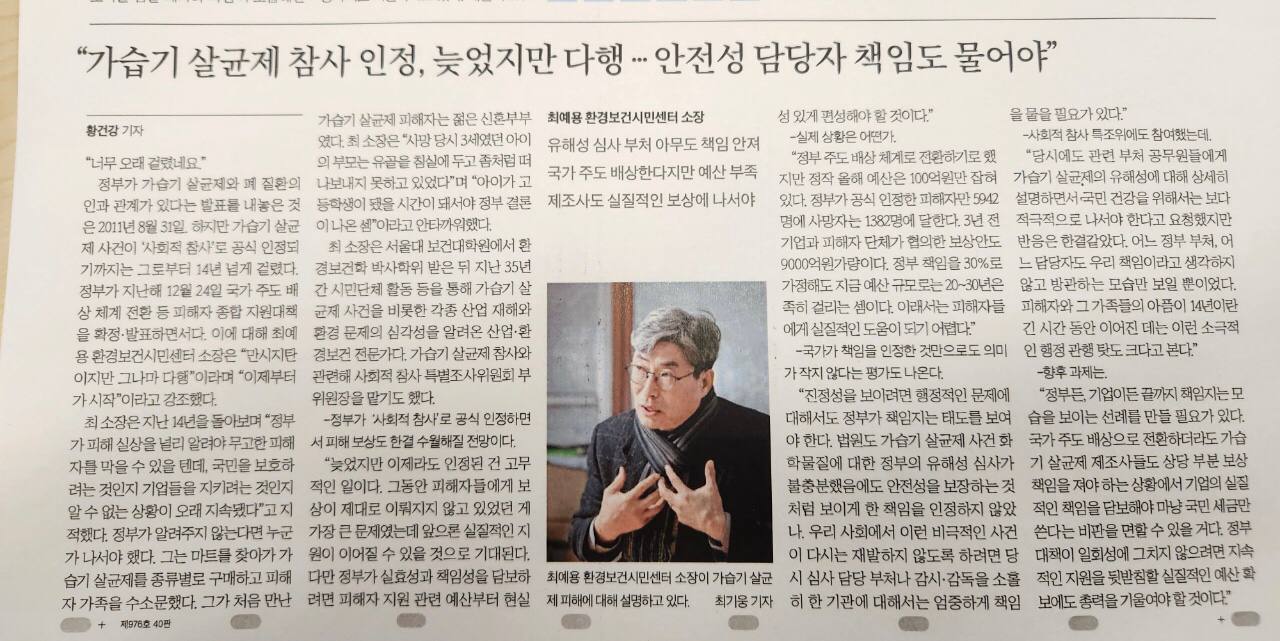 정부가 가습기 살균제와 폐 질환의 인과 관계가 있다는 발표를 내놓은 것은 2011년 8월 31일. 하지만 가습기 살균제 사건이 ‘사회적 참사’로 공식 인정되기까지는 그로부터 14년 넘게 걸렸다. 정부가 지난해 12월 24일 국가 주도 배상 체계 전환 등 피해자 종합 지원대책을 확정·발표하면서다. 이에 대해 최예용 환경보건시민센터 소장은 “만시지탄이지만 그나마 다행”이라며 “이제부터가 시작”이라고 강조했다.