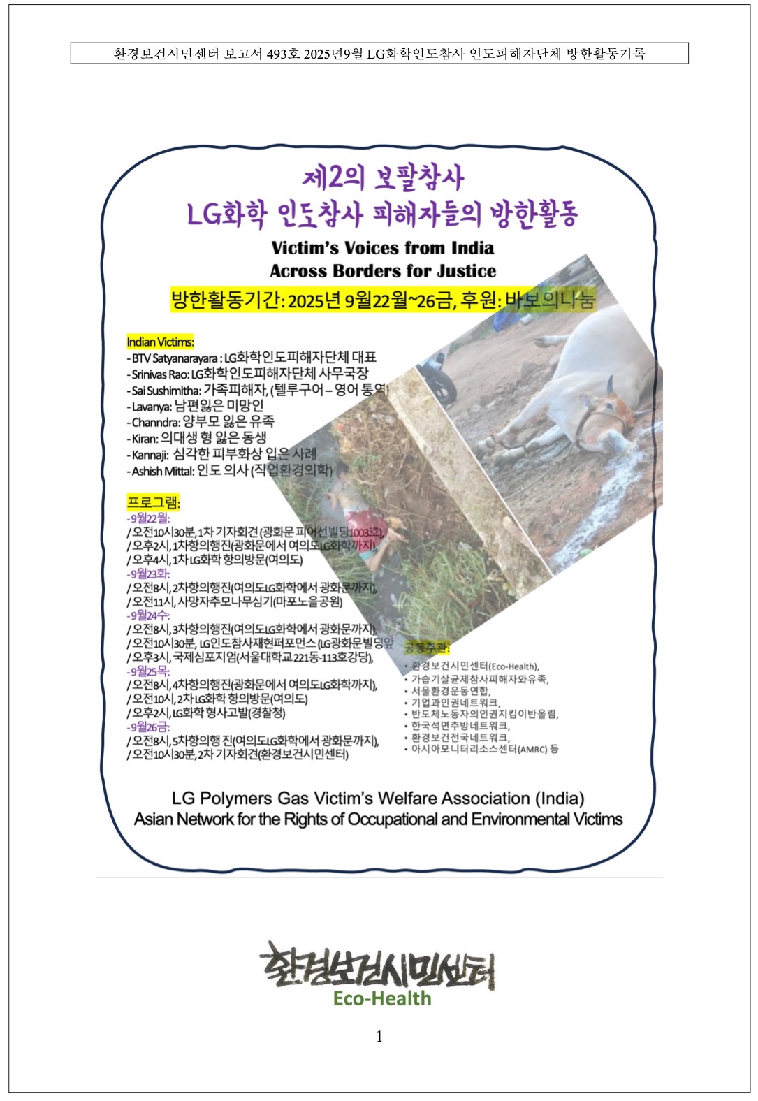 [보고서 493호] 2026년-6호, LG화학인도참사 2025년9월 인도피해자단체 방한활동 관리자 2026년 0 13 3시간전 2026.02.23 16:22 환경보건시민센터 보고서 493호 2025년9월 LG화학인도피해자 방한활동기록.pdf (27.3M) + 0 [보고서 493호] 2026년-6호, LG화학인도참사 2025년9월 인도피해자단체 방한활동기록입니다. 파일 첨부합니다. 아래는 보고서 표지입니다.
