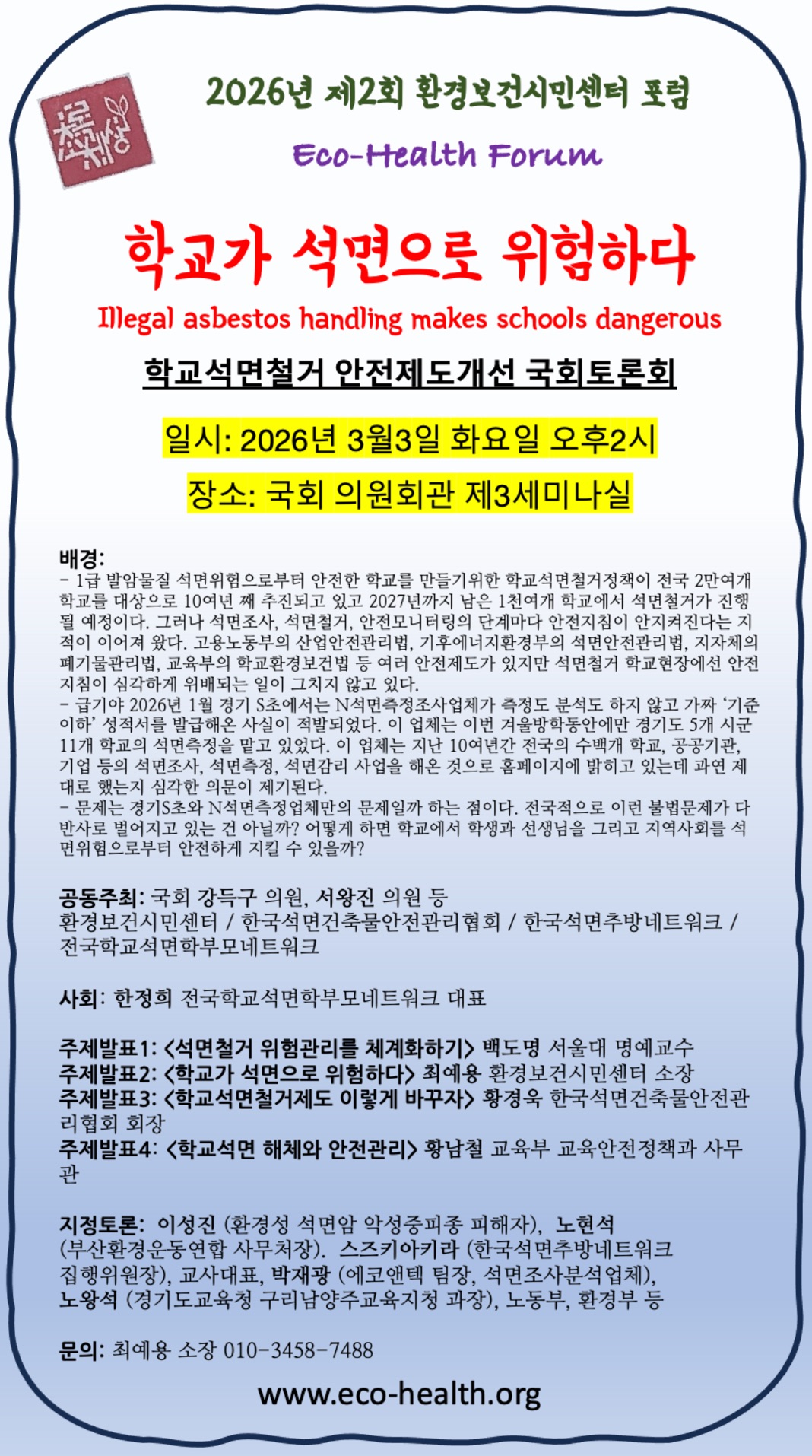 [2026년3월3일] 학교석면철거 안전제도개선 국회토론회 관리자 0 473 01.29 16:15 참고자료: (클릭)-2026년1월22일 MBC뉴스데스크 보도 <측정도 제대로 안하고 ‘문제없다’?, 문제투성이 학교석면철거> -환경보건시민센터 보고서 491호, 2026년 1월23일 학교석면철거와 엔플러스이 불법사례 링크 -환경보건시민센터 보고서 488호, 2026년 1월9일 겨울방학동안 석면철거중인 학교현황과 명단