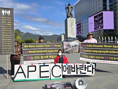 2025년 10월 23일 목요일 오전11시 서울 광화문 광장에서 열린 APEC 3차 캠페인 기자회견 및 캠페인 사진입니다.기업책임강화 주제로 엘지화학 인도참사와 보팔참사와 같은 선진국 기업이 개발도상국에서 사고와 참사를 일으켜선 안된다는 내용을 강조합니다.http://www.eco-health.org/bbs/board.php?bo_table=sub02_02…