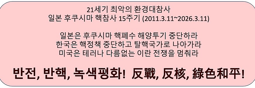 3월11일(수), 일본 후쿠시마 핵발전소 참사 15주기 (2011년), 동일본대지진 쓰나미피해로 후쿠시마 제1원전단지 1,2,3,4호 원자로 폭발 멜트다운, 원전반경20km 20여만명 원전피난민, 2023년부터 핵폐수 해양투기 계속